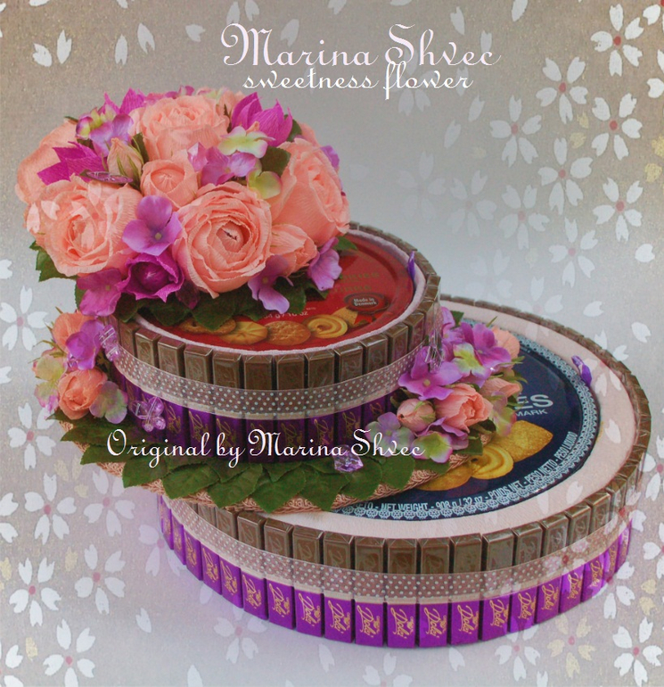 Да тортики я обожаю делать =) в нем совмещены самые вкусные (по моему мнению) вкусности, и печенька и конфетки-шоколадки =) прям пир для сладкоежки =) А тут еще и цвета все мои любимые от сиреневого до розового, прям делала и умилялась =)