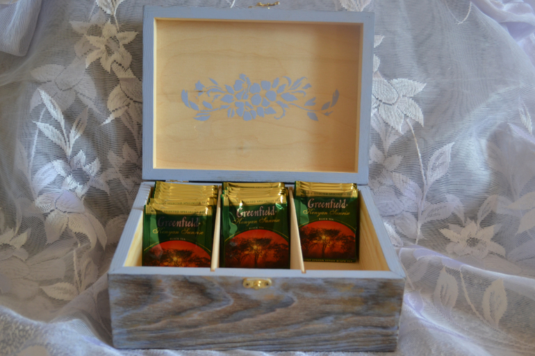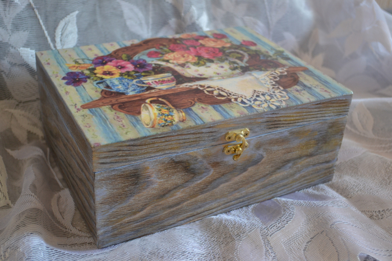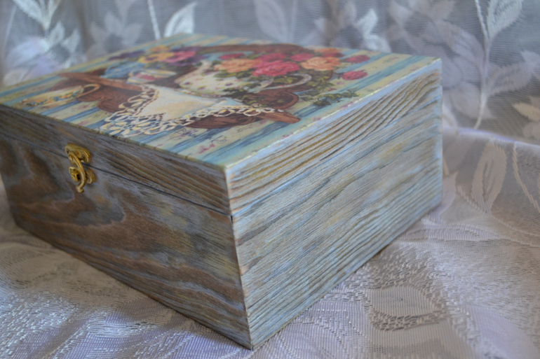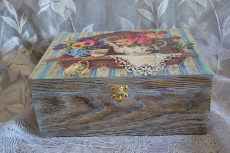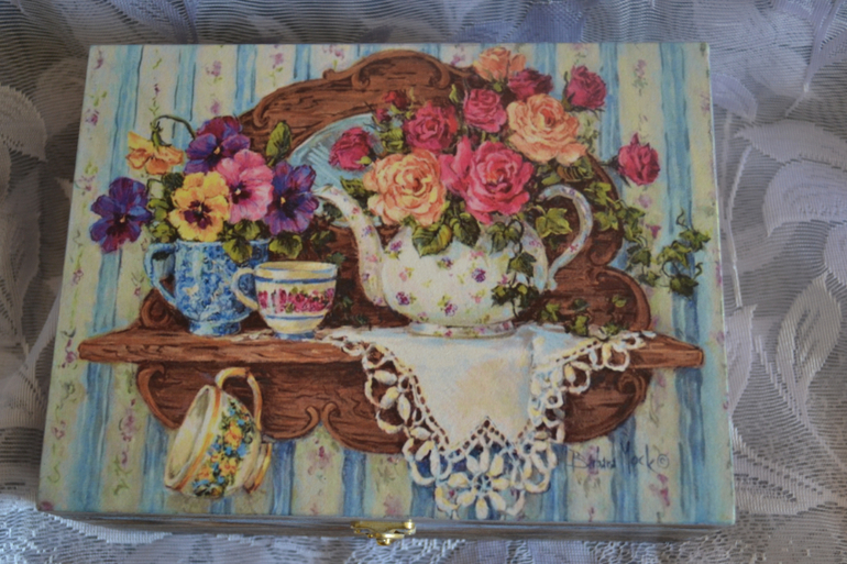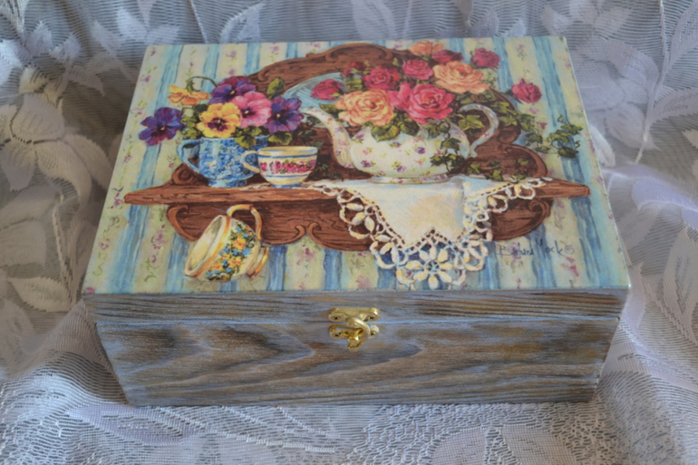 ДекупажОчень понравилась эта картинка, незабудки и розы восхитительны и вот они на моей шкатулочке для чайных пакетиков!