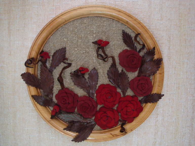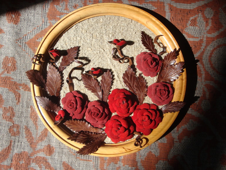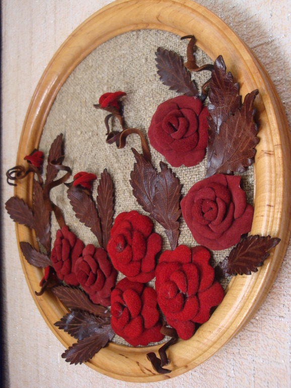 Изделия из кожиГода два-два с половиной назад решила я сделать топиарий с розами из замши и кожи. Розочек пару штук сделала, сделала заготовку для дерева и так на этом все и остановилась.. Вот, знаете, если не лежит к работе душа, то ты хоть тресни. И вот, по прошествии такого немалого времени, розочкам нашлось применение - заказали мне два панно из кожи. Одно панно - моя повторюшка панно "Виноград", а второе - что-то эдакое. Я четко решила, что работа должна быть в круглой рамке. И, кстати, чего-то мне захотелось сделать калину. Но потом я вспомнила о своей недоделке и уже точно знала, что я буду делать)