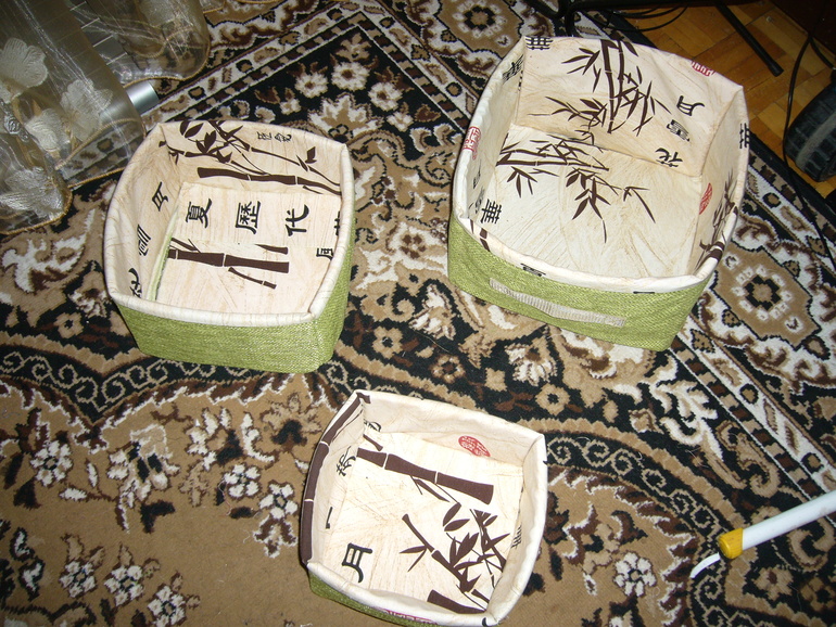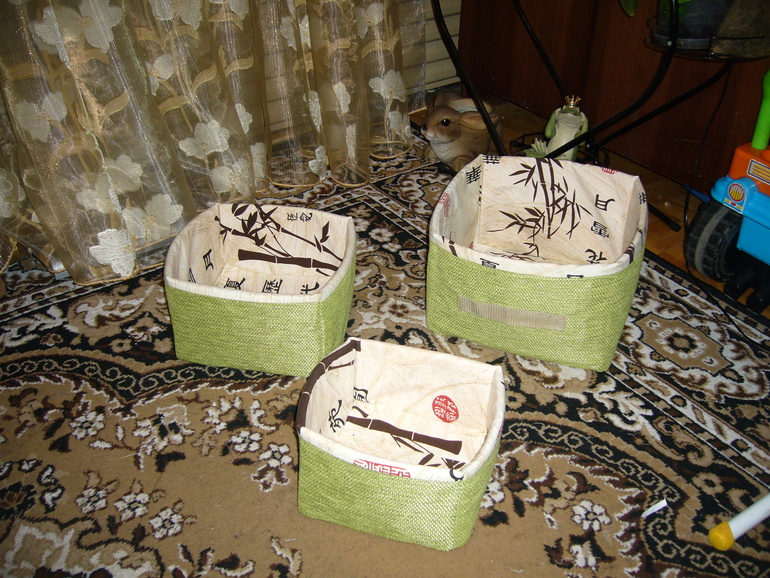 Мой рабочий уголок, запасы, инструментыЭти короба я сшила для ббешечки Натальи. Между двумя слоями ткани проложен изолон,для придания формы .В них можно хранить что угодно,начиная от игрушек и заканчивая принадлежностями для рукоделия. Приблизительные размеры 30/30/20 , 26/26/15, 22/22/13. Можно сложить по типу матрешки друг в дружку для экономии места,если вдруг короба не понадобятся