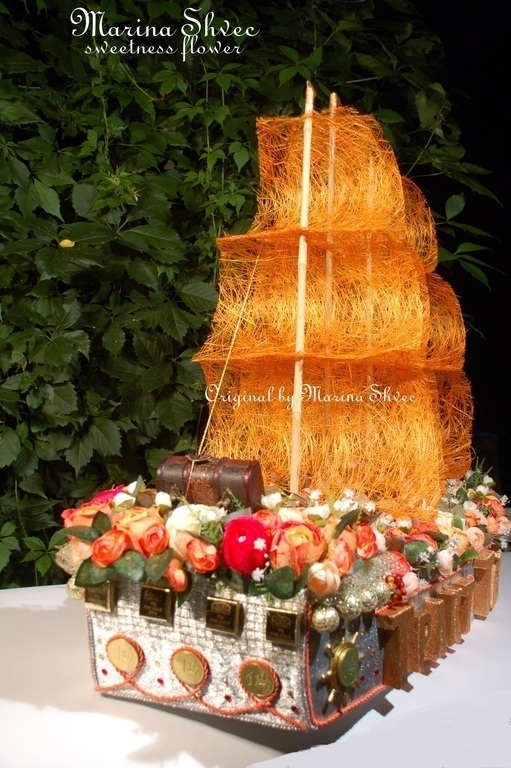 Цвет компании оранжево-стальной... сам корабль стал серебренным, а розы и паруса оранжевые. Надпись делала из пеноплекса и оборачивала в оранжевую металлизированую гофру. Почти 1,5 недели работы, последние 3 дня и 4 ночи без сна, и вот он)))