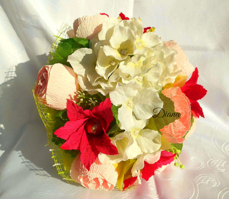 ну если заказчица такая рукодельница сама б и клеила-ей виднее как ей хочется-не расстраивайтесь.в букете -по мне- слишком много крупных тканевых цветов.