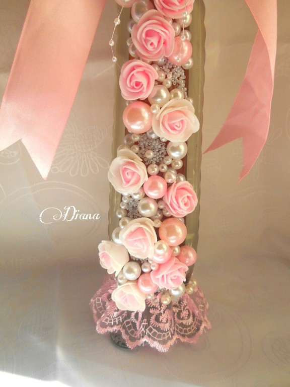 Коньяк очень мило вышло,не переживай,а в букете я бы белые искусственные заменила на несколько веточек мелкоцвета типа гипсофилы,и листики зеленые вяленькие какие-то