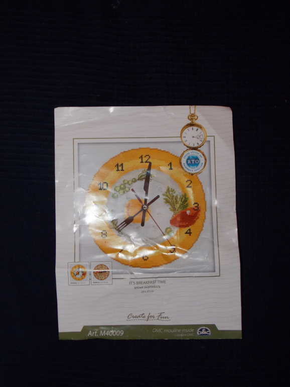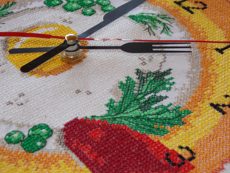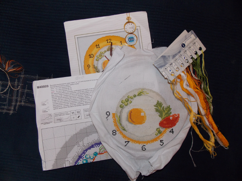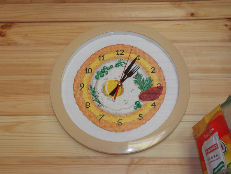 Года три назад захотелось мне сделать мужу подарок... Он у меня большой любитель яичницы!))) Купила набор для вышивки крестом фирмы РТО часы......