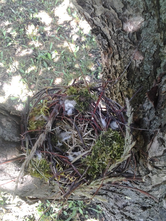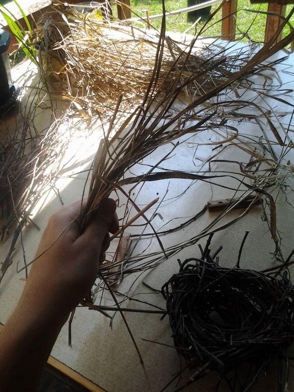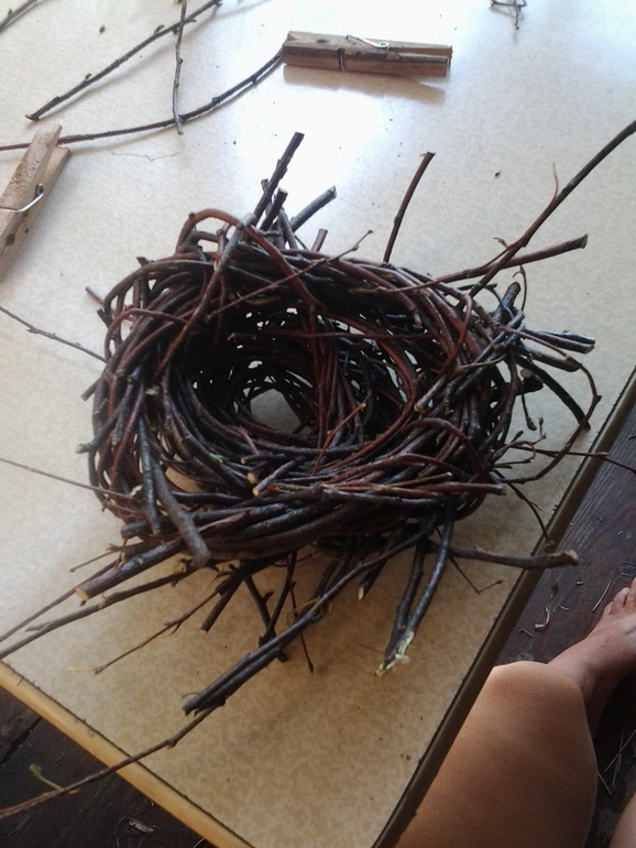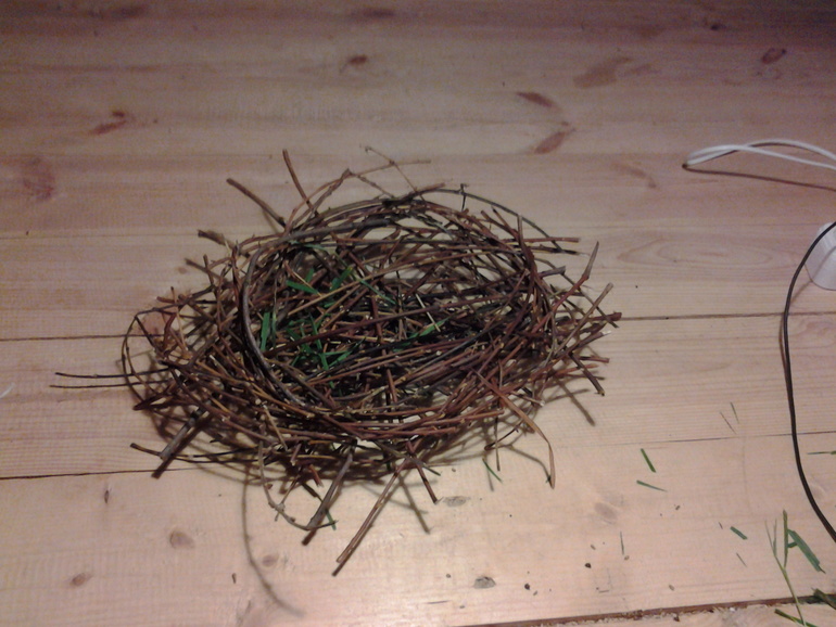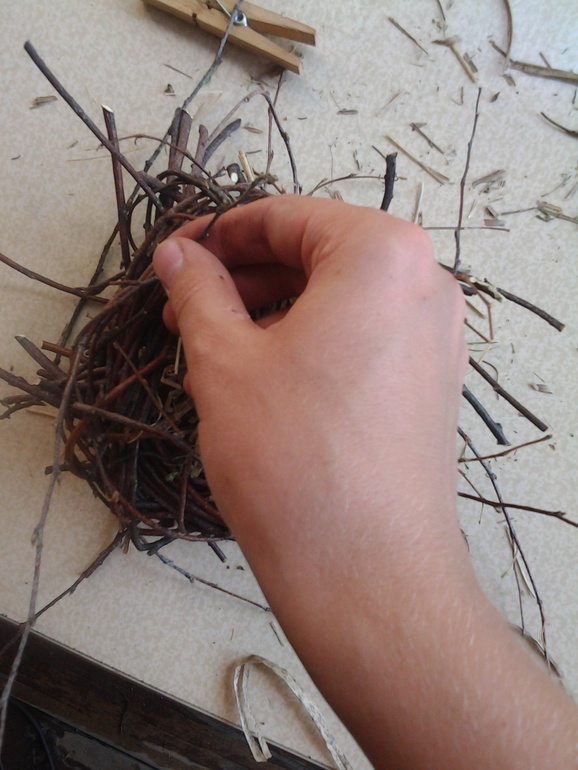 Ветки были слишком крупные, да и сам выбор витья - по принципу корзины был не естественным. Поэтому для придания гнезду естественности само гнездо держать форму не желало.