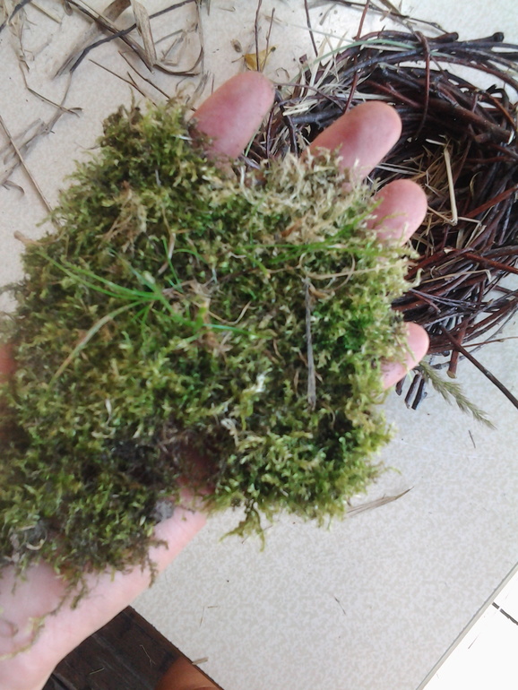 Дальше мох. Нашла я его на северной стороне нашего фундамента на даче. Еще он был в небольших количествах на камушках под сиренью, тоже в тени. Я сняла его, чтоб не порвать, стряхнула с него песок, и разделила аккуратно на небольшие кусочки. Эти кусочки прикрепила в разных местах своего гнездышка, закрепляя между веточками с помощью прутика потолще.