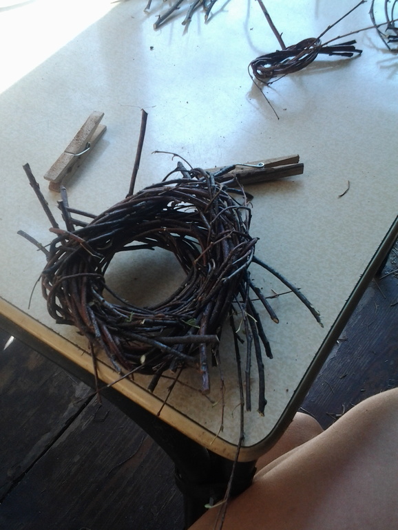Берем несколько веточек подлиннее и начинаем скручивать первый венок, тот что будет у нас потом задекорирован. Обвиваем веточки вокруг руки и делаем произвольный узелок. Оставшиеся края веточек заправляем между прутиками, и закрепляем узелок прищепкой.