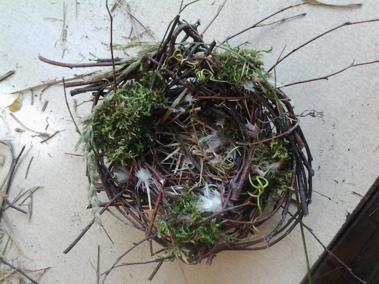 - мох, перышки из подушки, травки с колосками (для декора гнездышка)