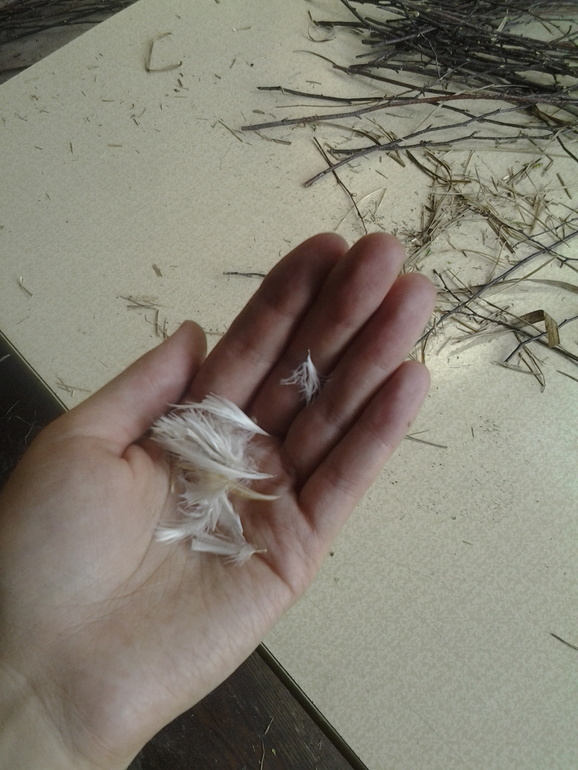 С перышками решила не увлекаться, вытащила несколько из подушки и острыми кончиками пропихнула их между веточками гнезда в разных местах.