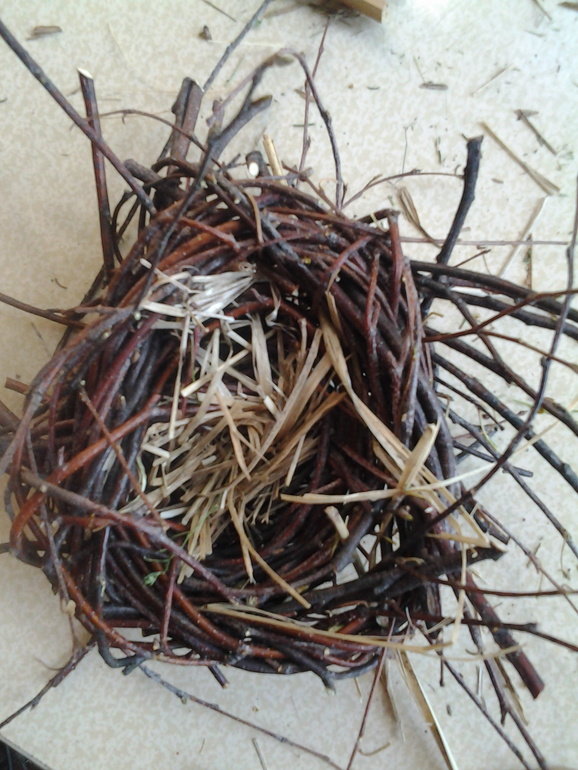 Скрепили все веночки и вот у нас уже вполне готовое гнездо. Но так как совсем маленькие веточки нам свернуть в узел не удастся, тут то и пригодиться солома.