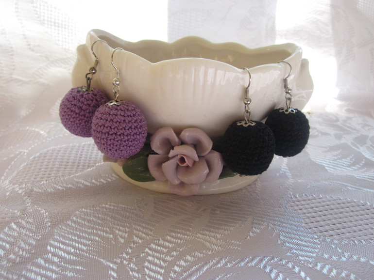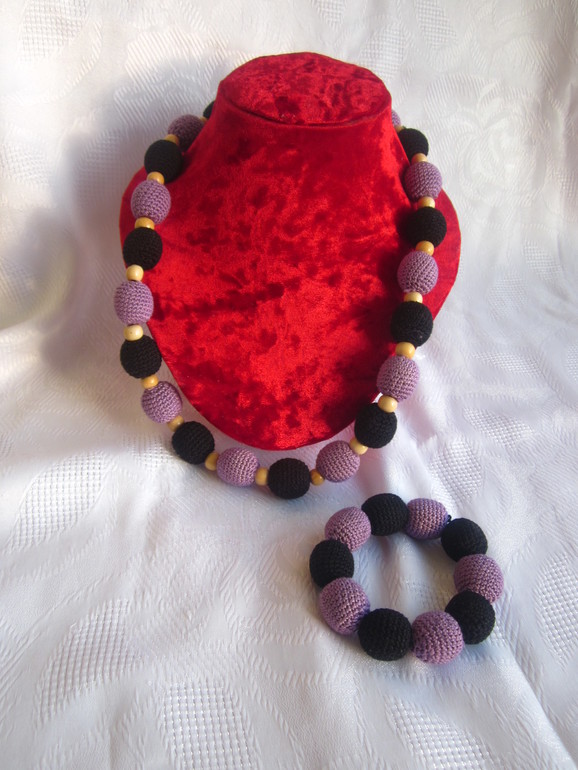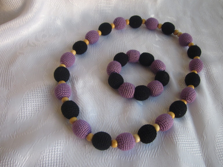 Бусики с самого начала были такие ж, как и браслет, чередовались обвязаные бусинки, но мне еще захотелось серьг, поэтому я разобрала бусы, сняла 4 бусинки(2 сиреневые и две черные), добавила маленькие деревянные бусинки, а из тех, что сняла, сделала две пары сережек.