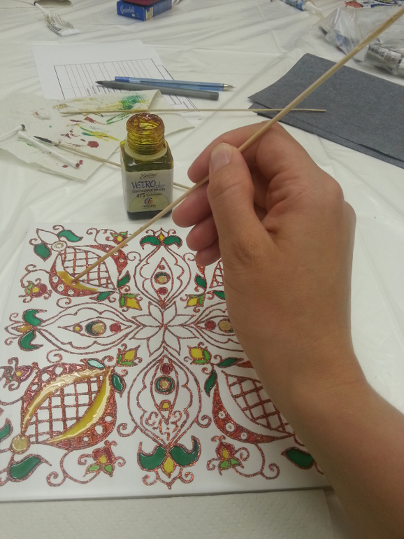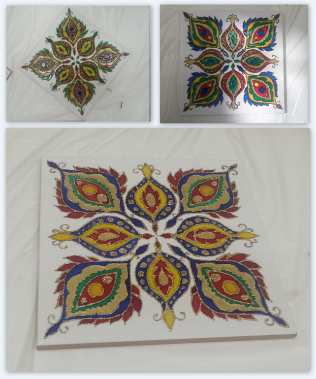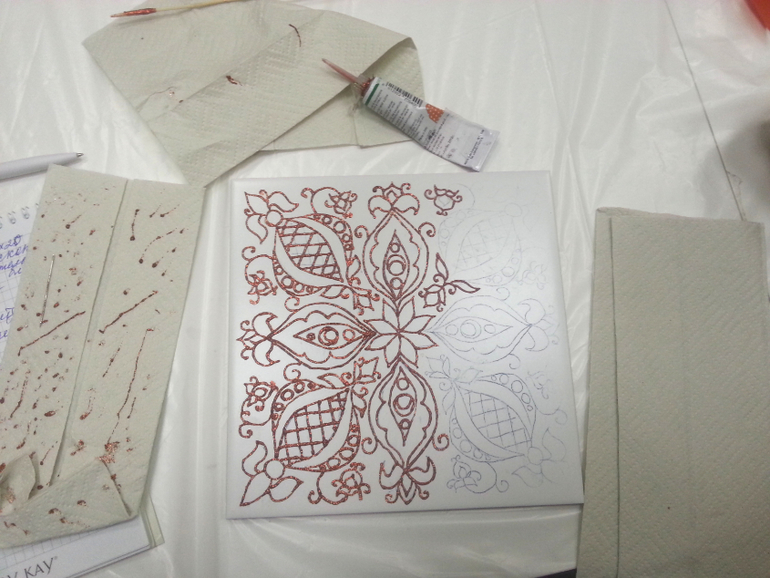 1. Обвести блестящим контуром FERRARIO уже перенесенный с помощью копирки на матовую плитку Kerama Marazzi узор.