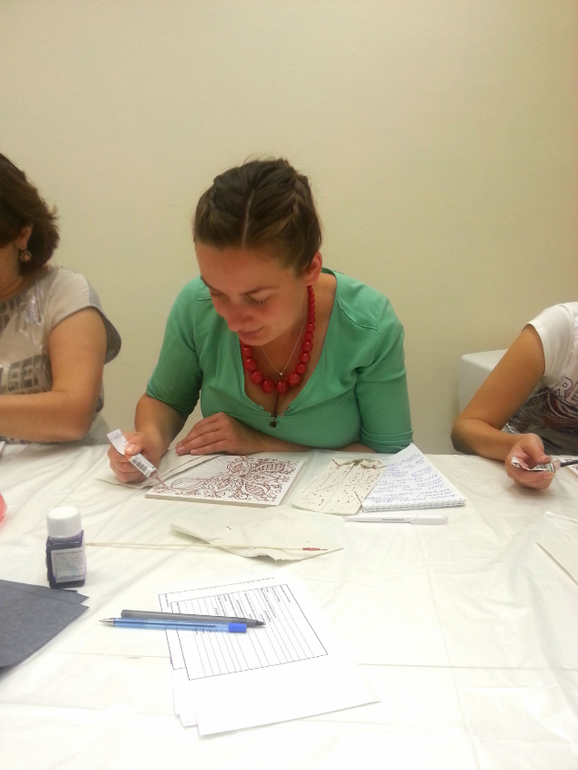 P.S.Покажу вам другие работы и то, как разными сочетаниями цветов один узор из русского превращается в "татарский", "царский" и прочее (эти определения давали сами участники МК.)
