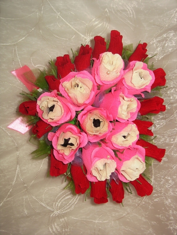 Конфетки хорошо в полисилк оборачивать,режет всё же глаз черные серединки,и лепестков розы можно добавить. Удачи!!!