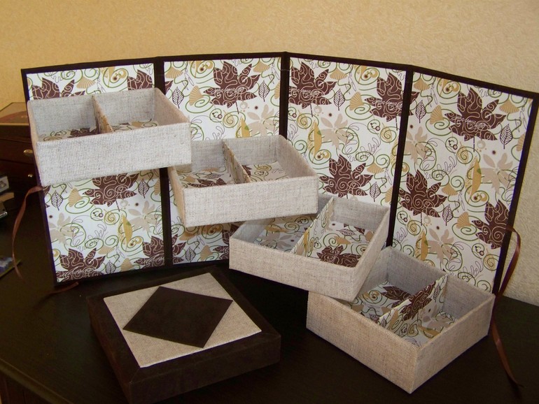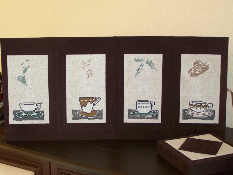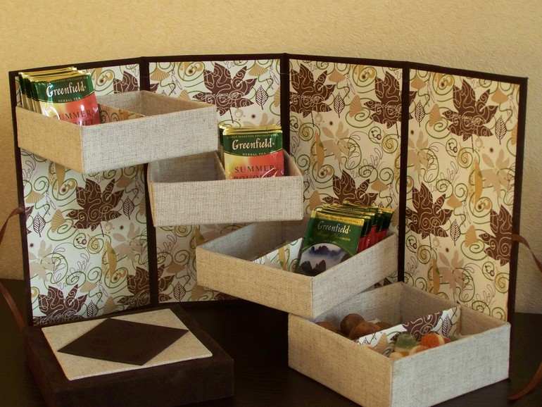 Эту коробку сделала еще в прошлом году и она уже радует своего владельца (очень надеюсь)). Когда-то очень захотела вышить эти картинки, а потом не знала как их применить. И вот пришла идея)). Внутренняя часть оформлена в стиле декупаж. Три отделения для чайных пакетиков и одно для сладостей и сахара.