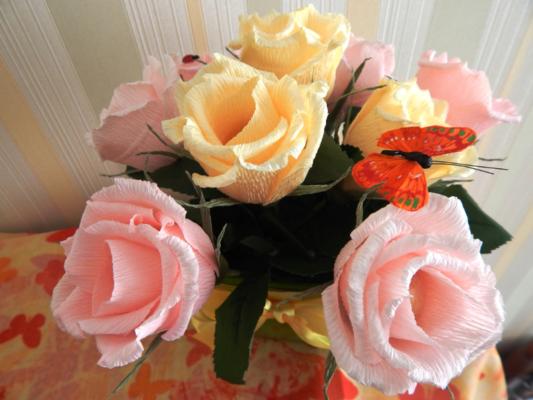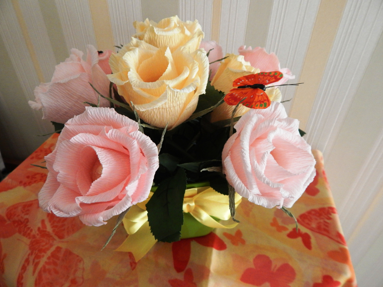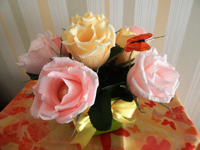 Олеся, с почином! Для первой работы очень хорошо! Если можно.. совет — конфетку заворачивать более плотно, в первый слой бумаги. Тогда больше будет похоже на бутон розы.
