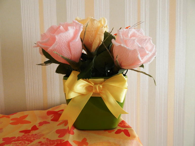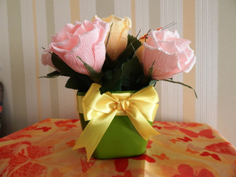 Вот здесь я нашла мастер-класс по изготовлению розы из конфет. Там еще очень много разных и интересных МК. В обычном магазине купила горшок для цветов, внутрь вставила флористическую губку, в которую воткнула уже готовые розы. Но держатся они не очень, т.к. я несколько раз их переставляла. Лучше берите пенопласт.