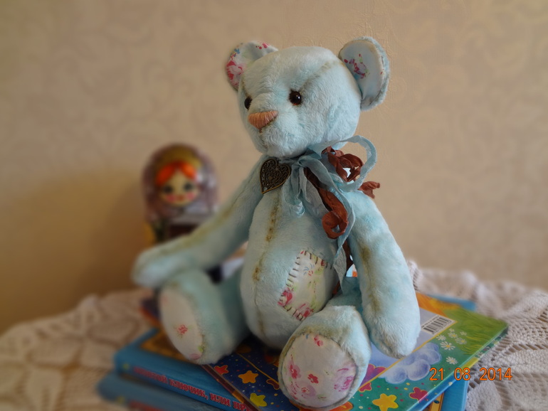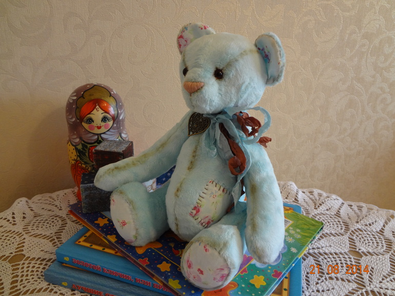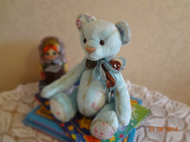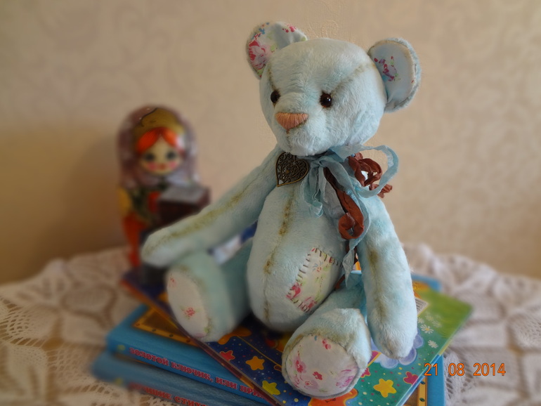 Мишка сшит из мягкого плюша и хб.ткани. Ручки и ножки на пуговичном креплении.Рост у мишки 27см.Тишка немного заштопан и тонирован маслом. На шее висит подвеска сердце.Глазки у мишки стеклянные.