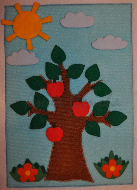 Основа игровой части панно - велкроткань на клеевой основе. Все остальное - фетр, обшитый вручную. Оформлено в виде книжки на один разворот размером - слева (формат А4) основа-дерево, справа - основа для крепления съемных элементов. Чтобы ребенок как книжку взял, сел за стол и занимался.