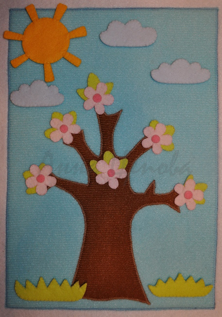 Я углы тоже не люблю, но вот тут скруглить не додумалась))) по поводу прошивки дерева- я в своем варианте на фетр (думаю,можно любую ткань взять) приклеила голубой, потом приклеела дерево, прострочила и потом пришила к основе книжки. На "стационарную" основу, думаю, можно приклеить на двусторонний сотч)