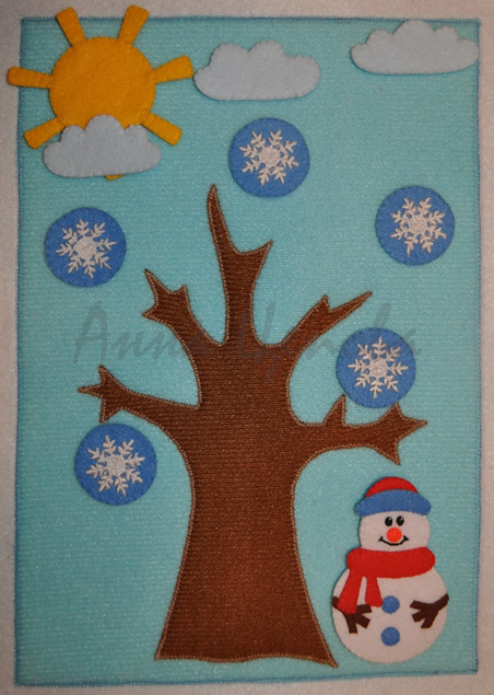 Воодушевилась я вашим мини-панно и решила сшить в подарок воспитателю ясельной группы, к которой ходил мой сын, племянник и теперь дочка :) День воспитателя был 27 сентября. Это мой первый опыт шитья фетра на машинке, но все получилось очень красиво. Размер 30 х 45 см, основа ДВП, на него самоклеящаяся пленка бело-голубого цвета, сверху велкро. Дальше фото по всем временам года. Большое спасибо вам за идею! Светлане за велкроткань :)