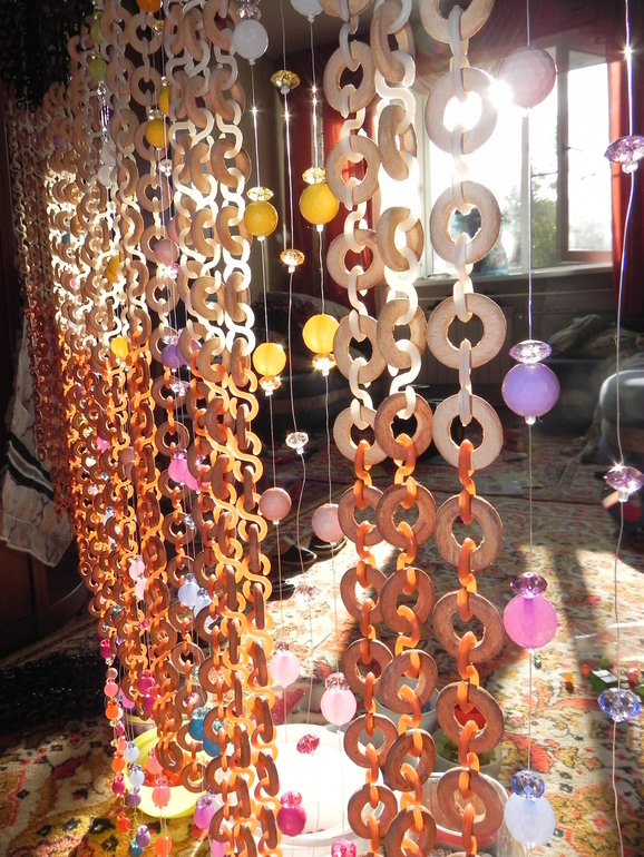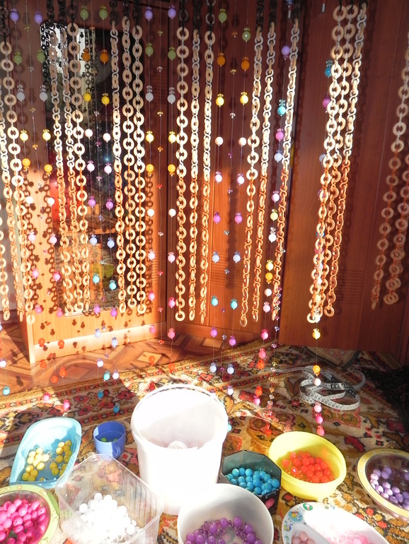 Декор, витражи.На изготовление ушло пять дней в перерывах между обязанностями, возложенными на меня семьей) купила в магазине бижутерии бусы с разными бусинами, а также леску, бисер, и кропотливо принялась за труд. Красиво необычайно. Хочу отметить, что бусинами дополнила ранее бывшие в моде шторы из деревянных колец.