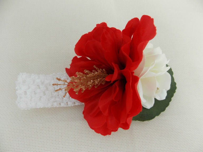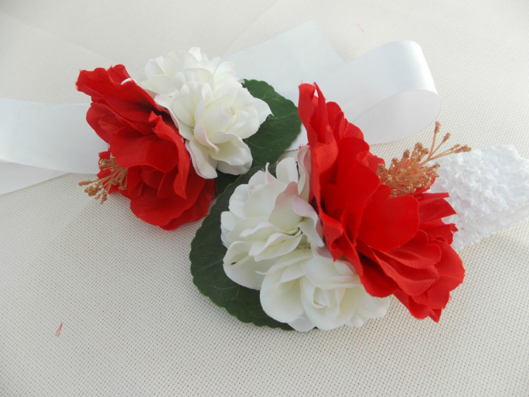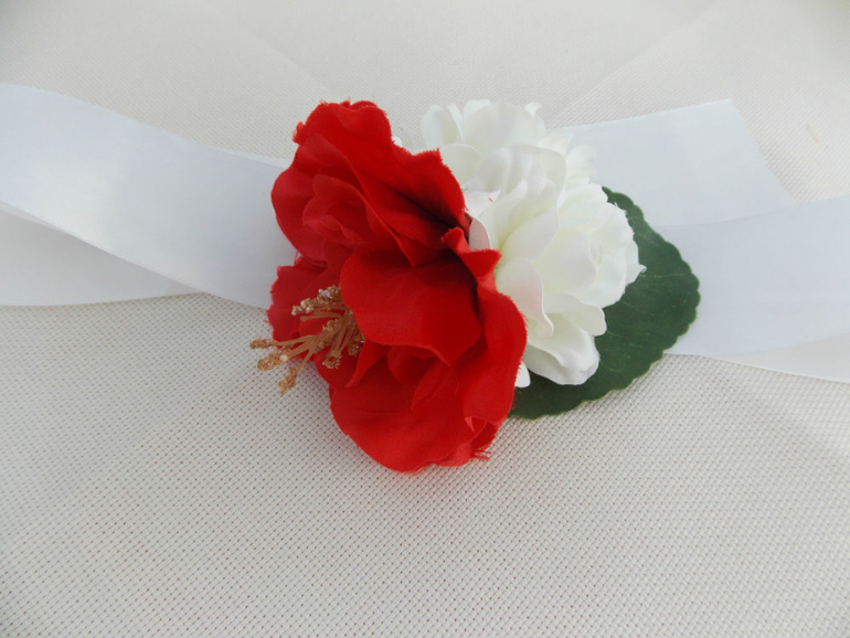 Белого гибискуса у меня не нашлось, зато я раздобыла алый, такой яркий и сочный, что аж глаз радуется. И разбавила его белой азалией, чтобы выдержать цветовую гамму Алесиного наряда.