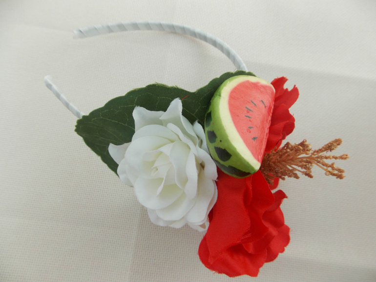 Но ананасы на складе закончились, пришлось быстро перестраиваться, и в итоге я остановилась на дольке арбуза. Выглядела она, конечно, далеко не так натуралистично, как смотрелся бы ананасик, но в общую концепцию ободка вроде вписалась неплохо.