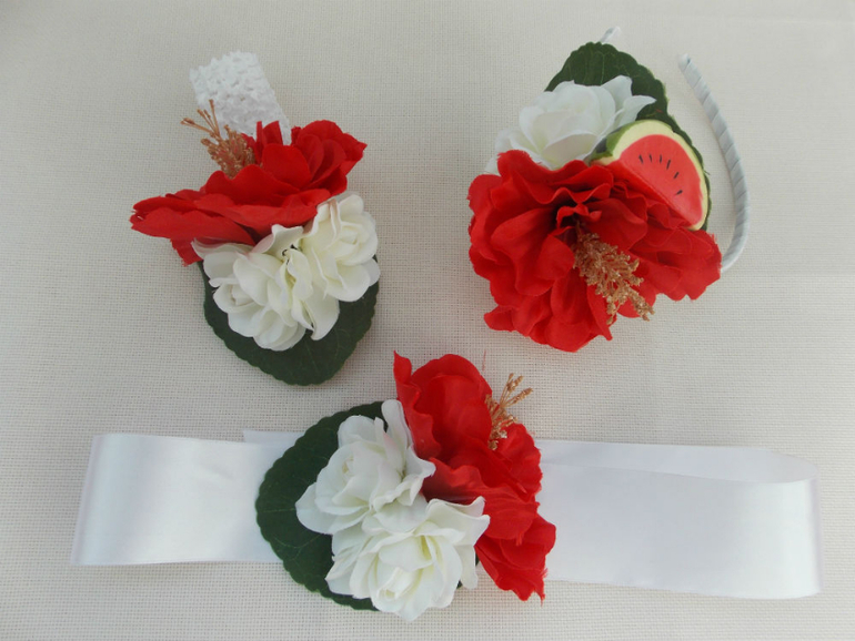 Комплектик состоит из ободка для мамы, повязочки для малышки и браслета на ногу.