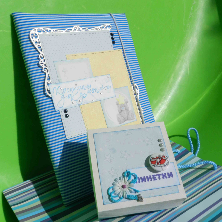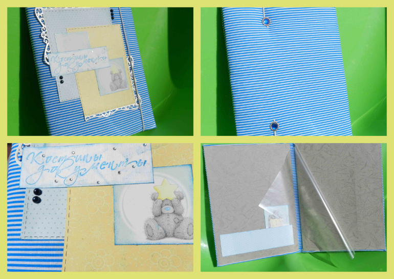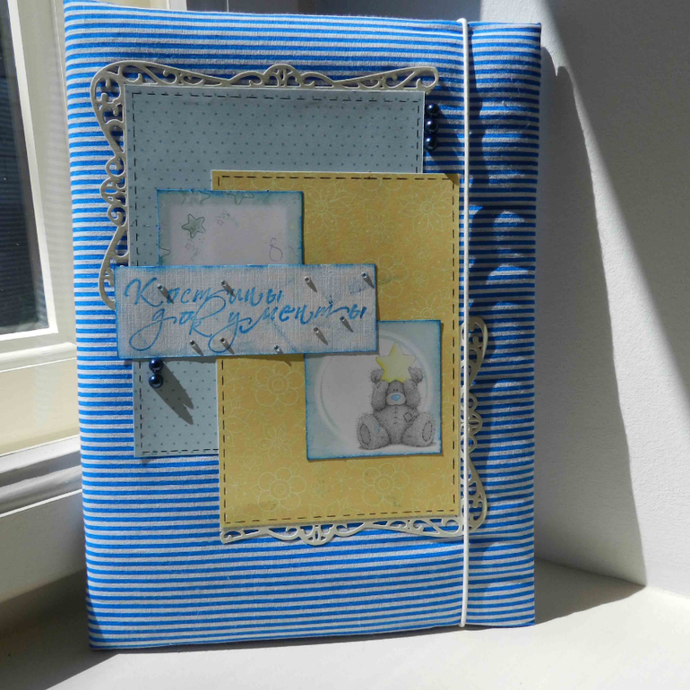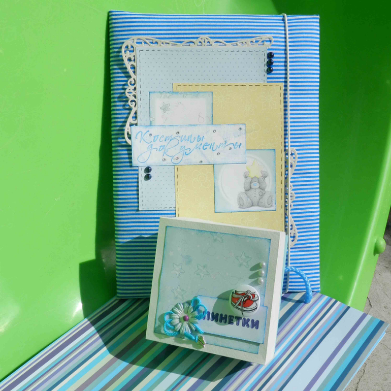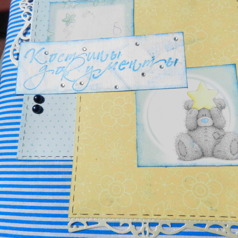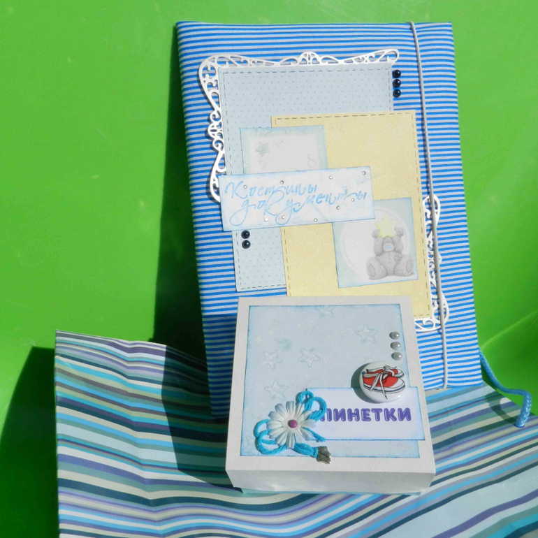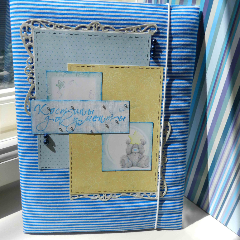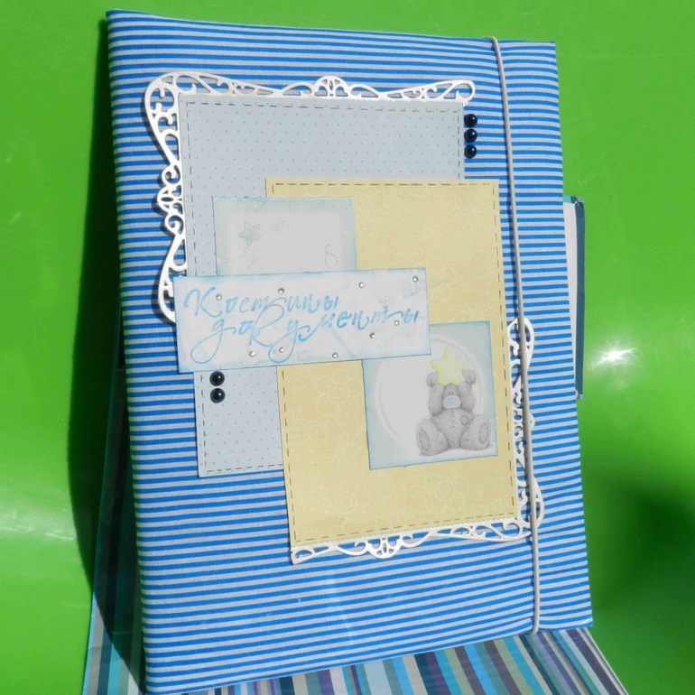 СкрапбукингДобрый день!Сегодня хочу показать свою первую детскую папочку под документы. Сделала ее для нашей ББ-шки Алены и ее сыночка Константина. Еще в комплект буду делать Сокровищницу, но об этом позже))) Папочка размером 19,5Х26,6, в мягкой тканевой обложке. Закрывается на резинку. Внутри файл для свидетельства. И кармашки для других документов.Декор необъемный, чтобы удобно было носить в сумочке.