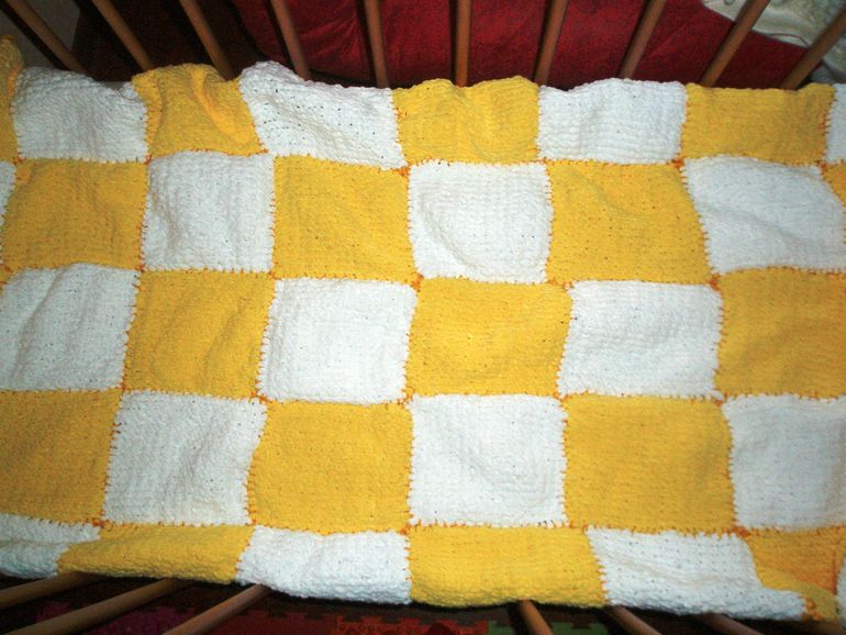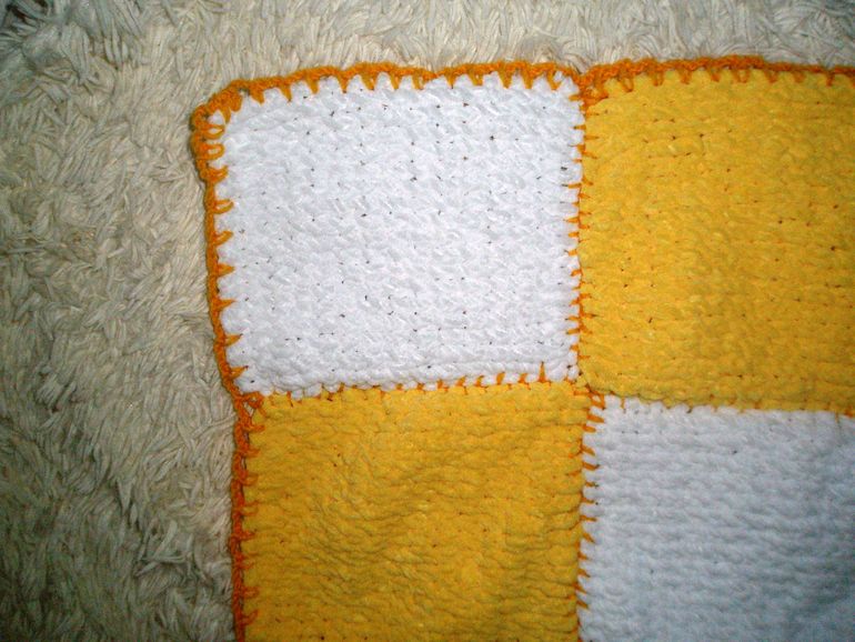 Соединялись прямоугольники крючком №6, нитками Alize Lanagold, цвет 216 (49% Шерсть, 51% Акрил). Соединялись прямоугольники полустолбиками http://www.youtube.com/watch?v=RSZPP5y7OU0 Обвязывались края элементом "решетка" (взят из книги).