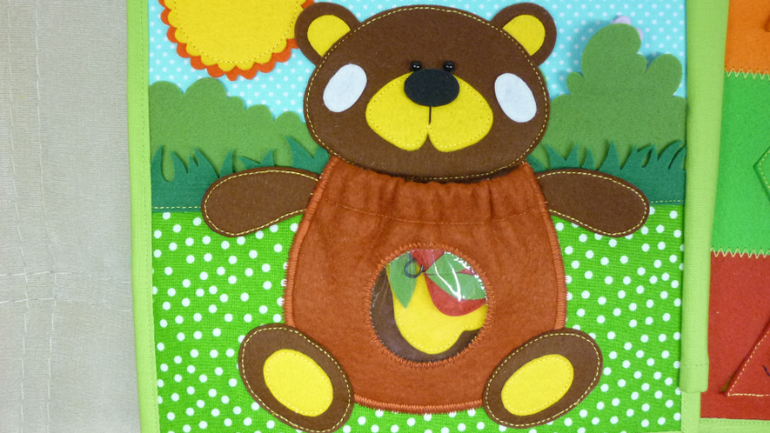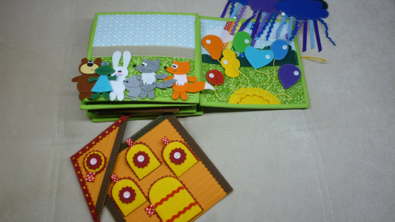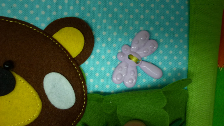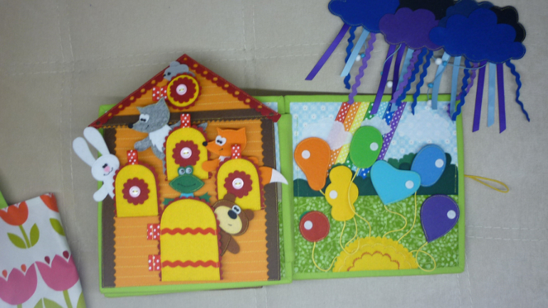 В книжечке я сделала его разъемным(крышу можно снять, как и сам теремок) Оборотная сторона, это жесткая часть липучки, благодаря чему, домик можно использовать для игр на ковролинографе.