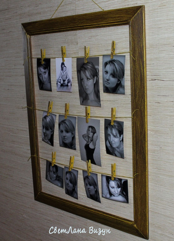 Я покрасила деревянную раму в заданных цветах. затонировала веревочки и покрасила деревянные прищепки.