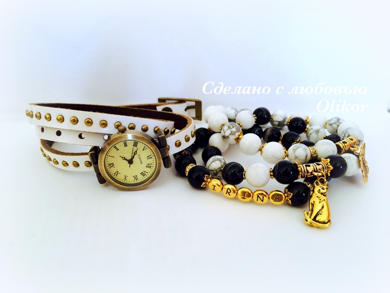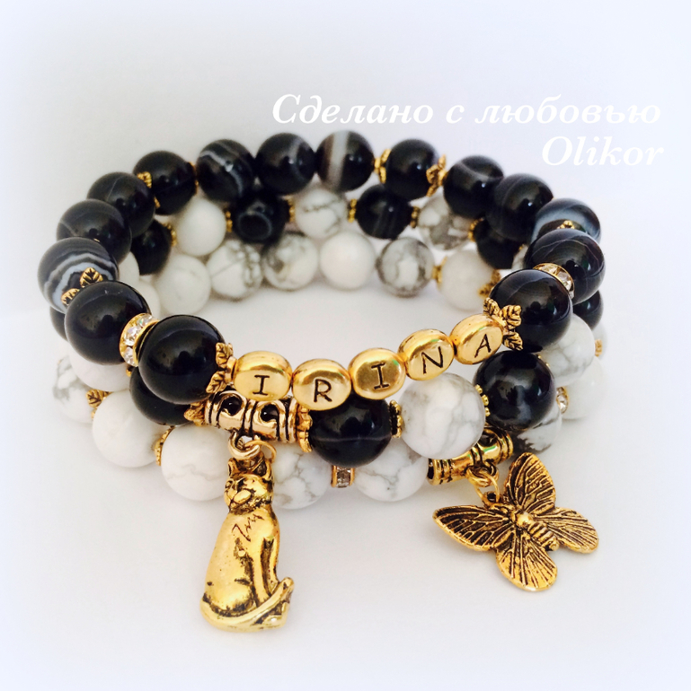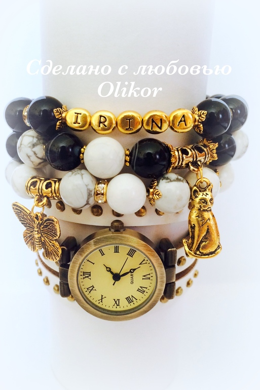 Интересный и практичный комплект для девушки Ирины из натурального агата и кахолонга с часиками. В комплект браслетов добавили имя хозяйки и подвеску-кошечку (догадались, что она кошатница?=). Получился оригинальный и необычный подарок.