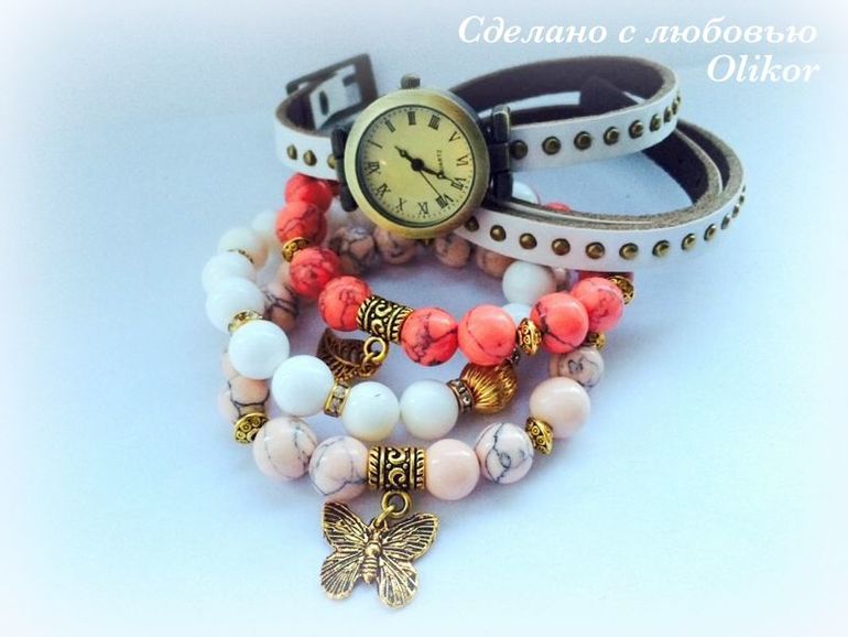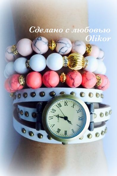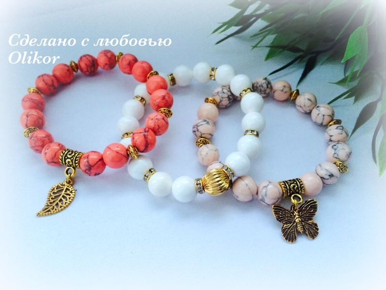 Делала в подарок своей подруге в ее любимых цветах: нежный розовый и озорной коралловый. Использованы белый агат и тонированный кахолонг.