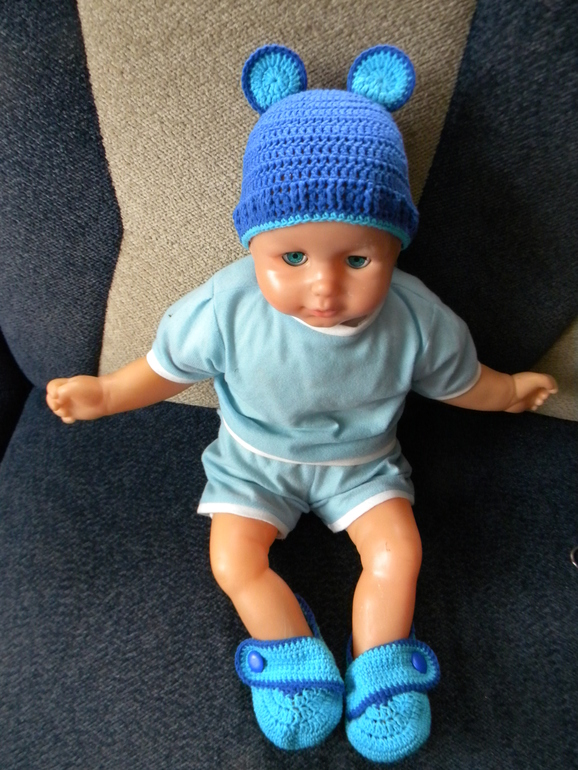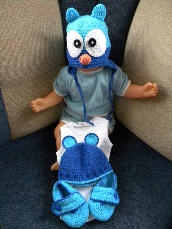 Комплект связался для сына моей соседки-подружки из остатков, пряжа Джинс. Правда пинетки-туфельки получились не такие как хотела. Решила в подарок и шапочку-сову положить - будет на вырост)