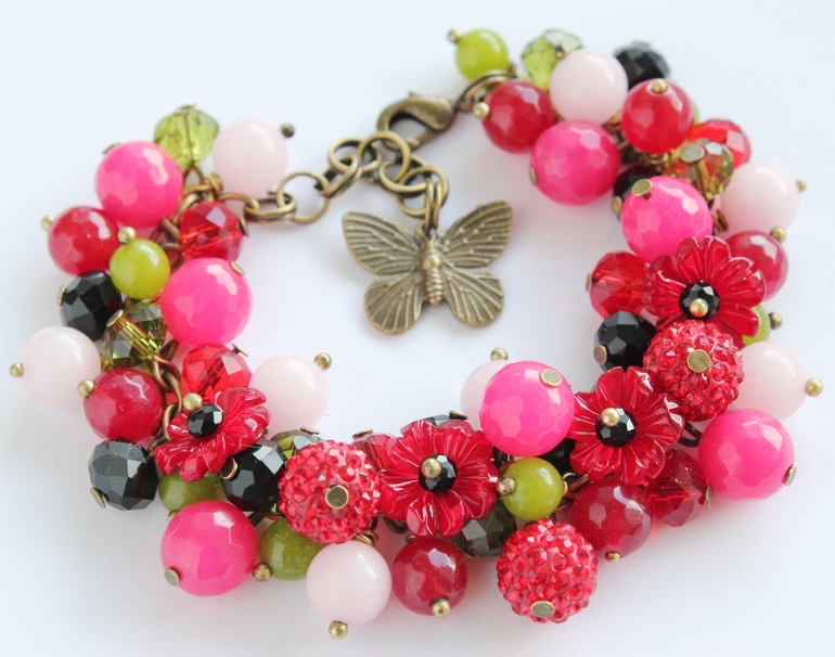 Браслет выполнен из агата, стразовых бусин, кошачьего глаза, акриловых цветков, гранёных бусин и фурнитуры под серебро.