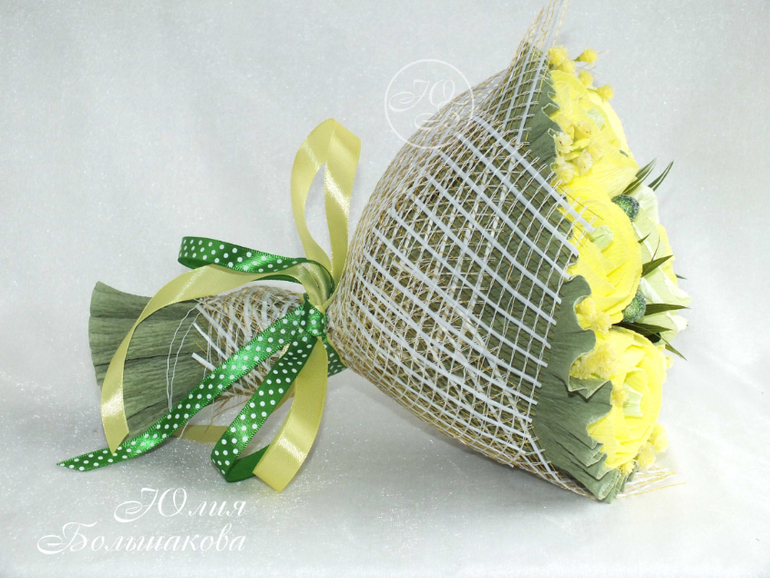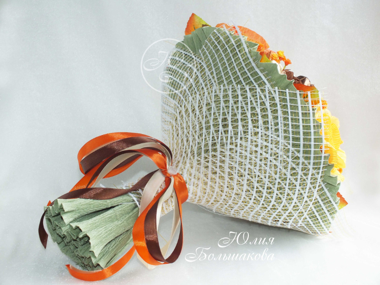 Я тоже долго крутила, вертела. Приспособилась так — либо вырезаю из пеноплекса круг, обтягиваю зелёной гофрой, цветы креплю на шпажки и прокалываю насквозь, потом собираю шпажки и фиксирую скотчем. Заворачиваю в гофру и одеваю рукав из гофры. Или к пеноплексу приклеиваю ручку, центральный цветок на шпажке, остальные на проволоке, всё убираю в ручку. Как то сумбурно)))