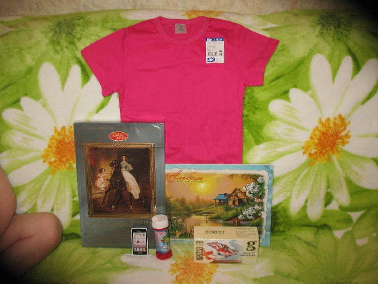 А это для нас. Плюшке футбол очка (завтра в сад наденем). Альбом для рисования (уже рисует сидит) мыльные пузыри (это у нас слабость). Конфеты, мммм...... чаек, зажигалка в виде телефончика - это нашему папе в коллекцию.