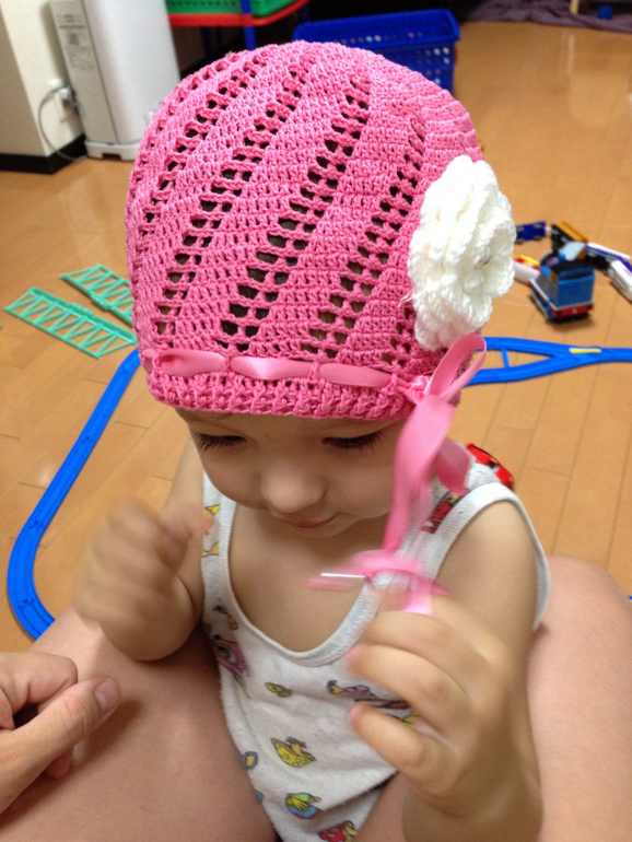 Знаю, знаю, что у меня рисунок с изнанки, но мне так больше нравится. Надеюсь на заказчице будет лучше, чем на моей модели, т.к. там девочке почти 5 лет и голова побольше.
