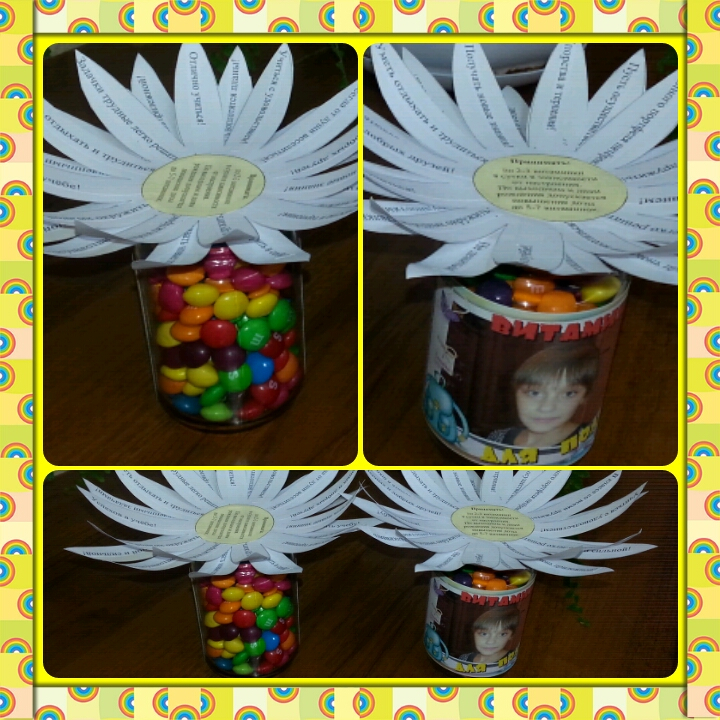 А на крышечке Ромашка с пожеланиями ученику)))))) а в серединке инструкция: принимать по 2-3 витаминки в зависимости от настроения, в выходные и праздничные дни возможно увеличение дозы до 5-7 витаминок))))