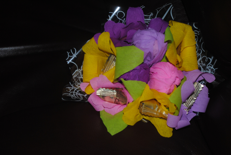 Юля, не соглашусь, причём здесь избалована или нет? Сейчас такие красивые коробки и с чаем и с конфетами, что просто по отдельности это будет намного лучше, чем этот букет, просто зацепило, вот и мимо не прошла.)))Я свои первые букеты подарила воспитателями в сад, если честно, сейчас стыдно, что так сделала, лучше бы по шоколаде купила))))