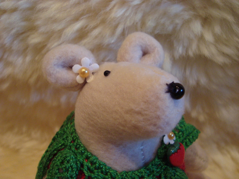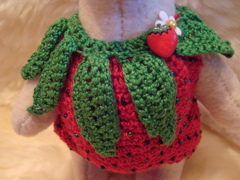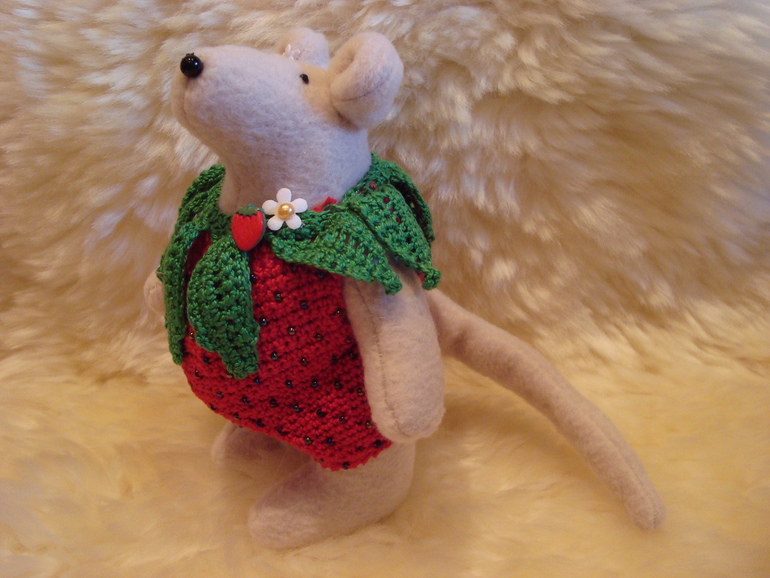 Это был обмен Клубничный, поэтому мышка одета в костюм "Клубничка", связанный крючком из ириса, бисер ввязан.