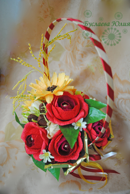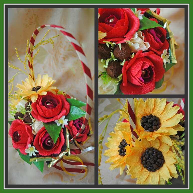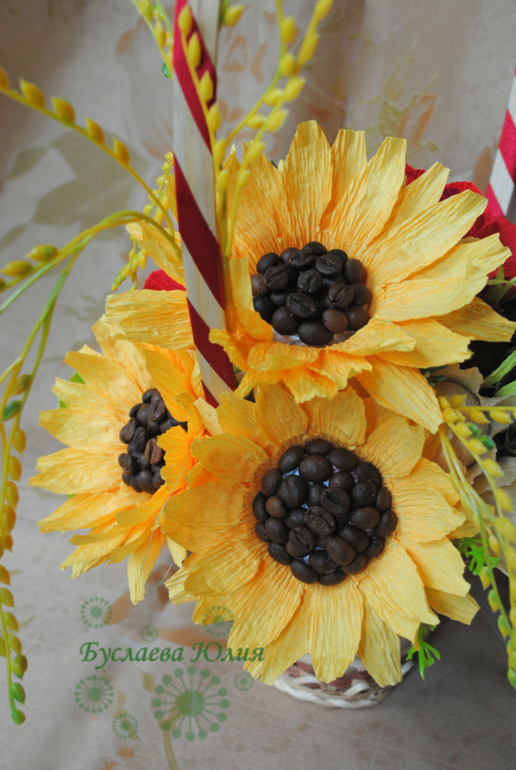 А началось всё с желания сделать подсолнухи (большие не люблю, потому получились скорее подсолнушки), а уж дальше пошло-поехало и весьма быстро. Одна бессонная ночь и вышло то, что вышло... Но я очень довольна результатом и клиентка кстати тоже.