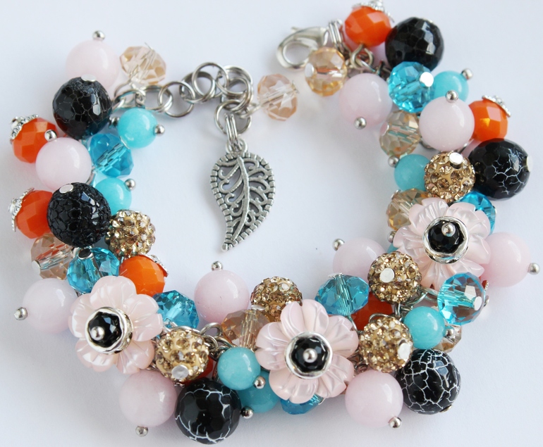 4) Браслет "В стране цветов" выполнен из агата, агата кракле, перламутровых цветков, стразовых бусин, гранёных бусин и фурнитуры под серебро.