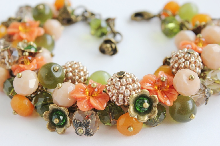 7) Браслет "Лето" выполнен из агата, граната, кошачьего глаза, стразовых бусин, перламутровых цветков, гранёных бусин и фурнитуры под медь.