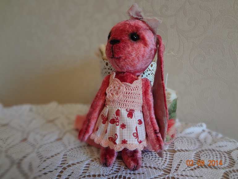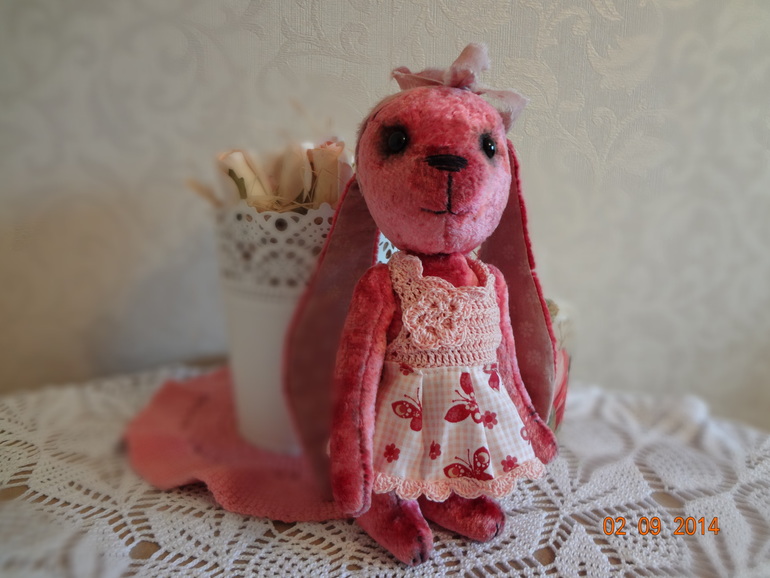 Игрушечный мир - животныеЗайка сшита полностью вручную из винтажного плюша,набита шерстепоном и утяжелена металлическим гранулятом. На шплинтовом креплении. Глазки стеклянные. Зайка ростиком 21см.