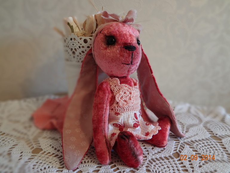 Зайка сшита полностью вручную из винтажного плюша,набита шерстепоном и утяжелена металлическим гранулятом. На шплинтовом креплении. Глазки стеклянные. Зайка ростиком 21см.