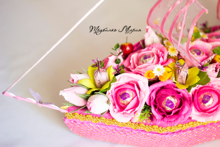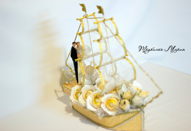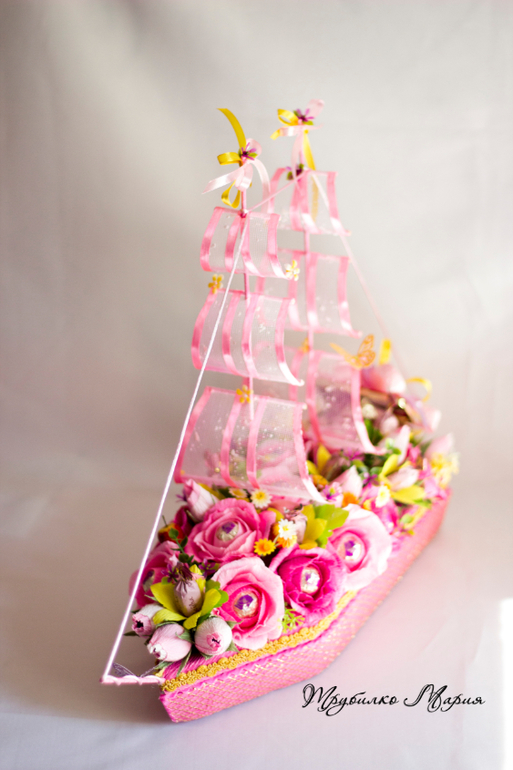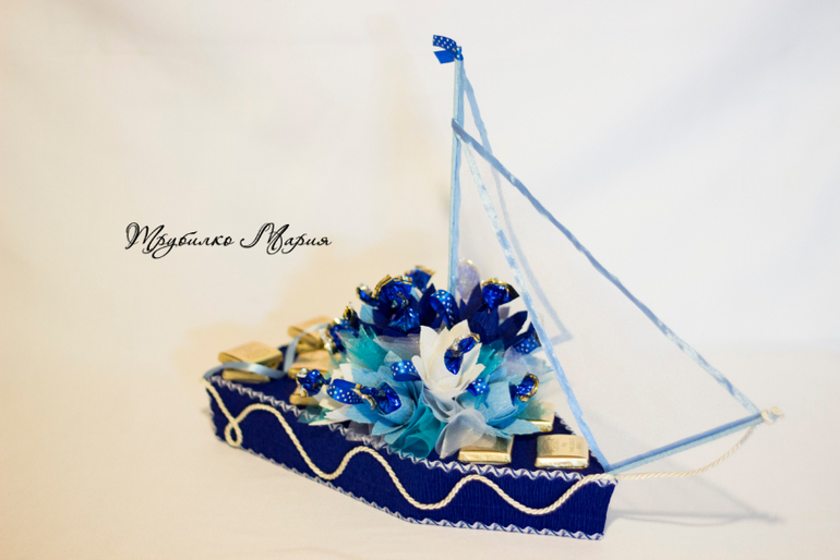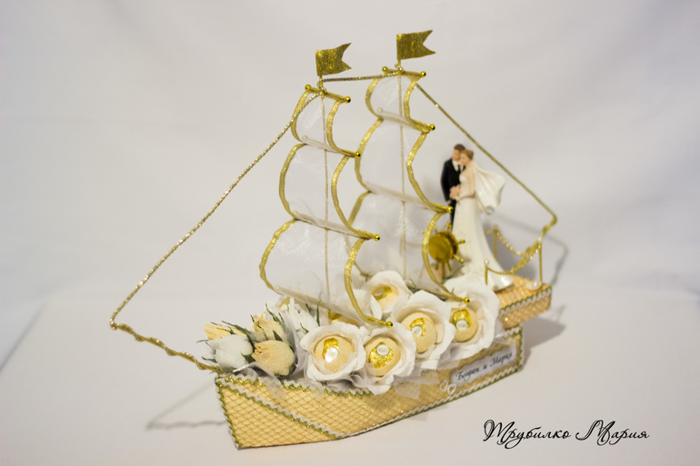 И последний кораблик..., за него огромное спасибо Елене Ч.!!! заказчица просматривала кораблики из папочки, куда я скидываю работы, которые мне очень нравятся и ткнула в него пальчиком: именно в такой гамме и именно такие паруса, только 2. Не скрою, мне давно хотелось попробовать сделать паруса из сетки с ленточкой, на идею трюма тоже подтолкнул др. кораблик Елены. Лена, надеюсь я не очень обидела вас и ваше творчество, большое спасибо за идей, этот кораблик многому меня научил!