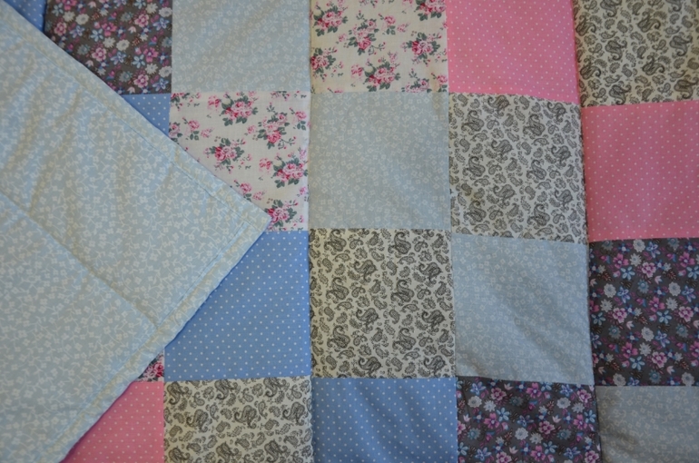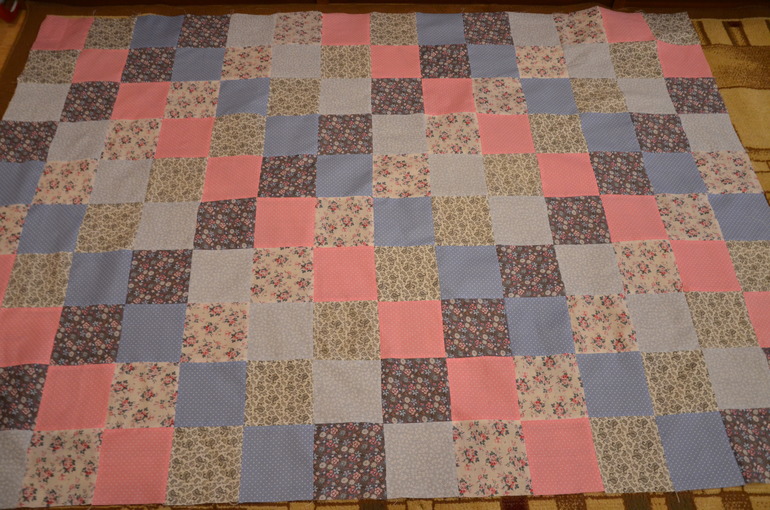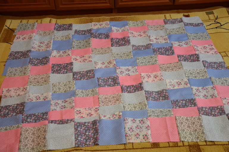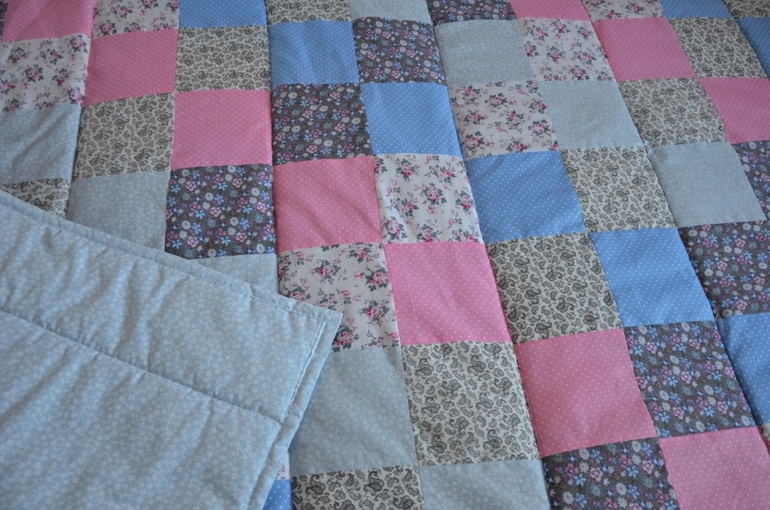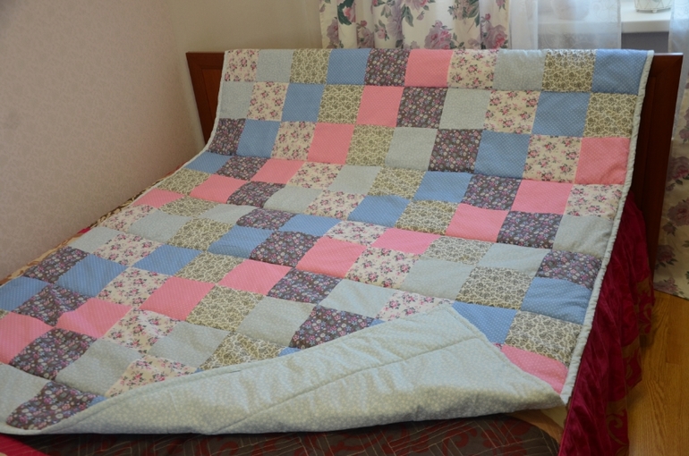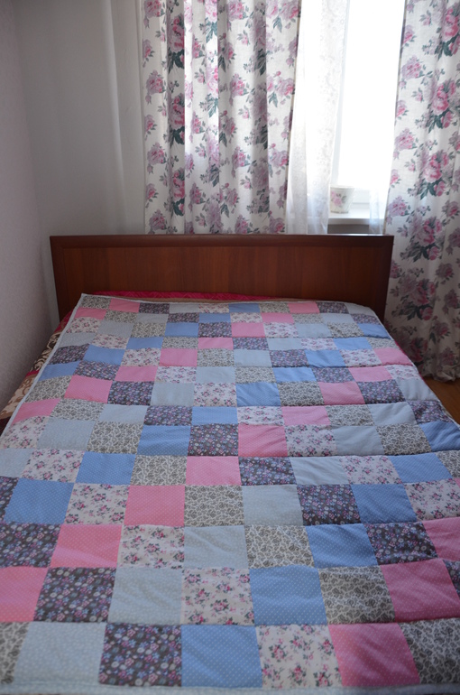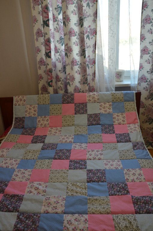 Еще ткань по фактуре была разной, 3 вида поплотнее и 3 вида тоненькая. Та что тонкая, очень тянулась. Сложно было совмещать швы. Ну и синтепон был в продаже только толстый, поэтому мое покрывало больше походит на одеяло. Ну и еще я его простегала немного строчками поперек, не каждый ряд, а через два.